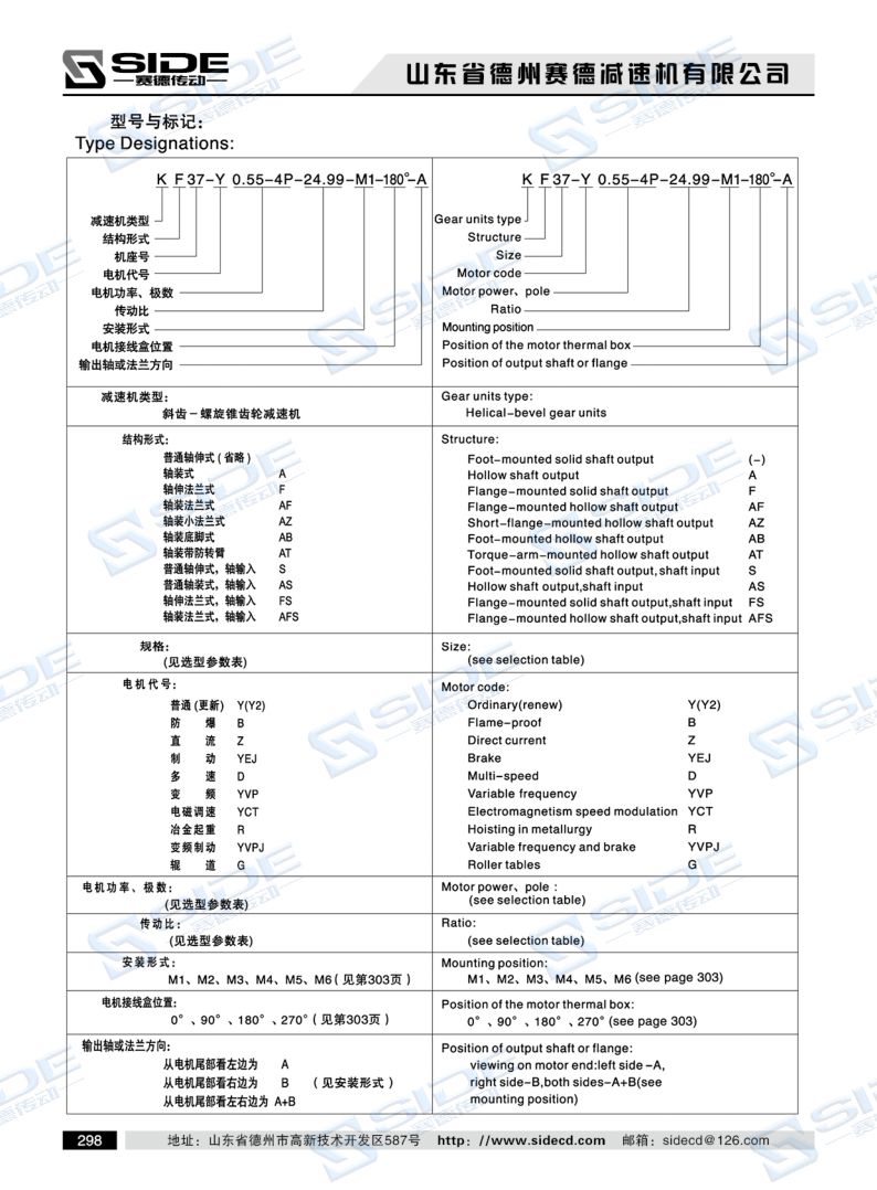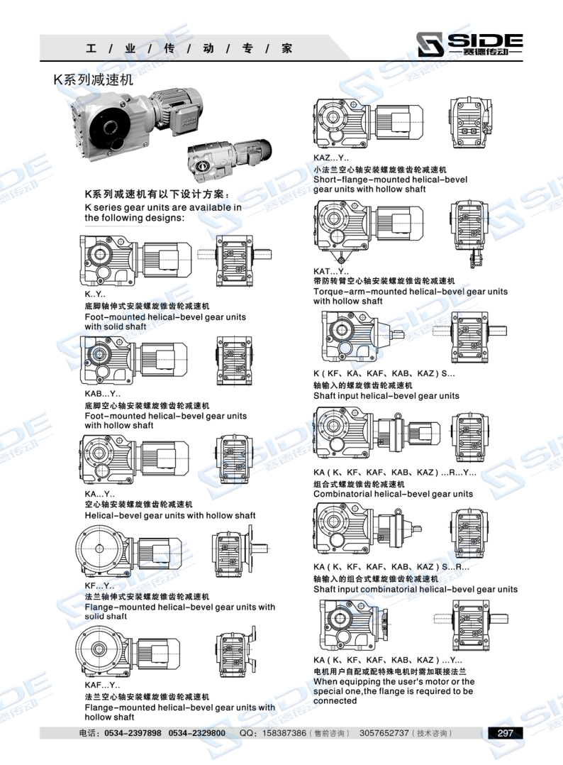 结构形式:K-轴伸式、底脚安装;KA-轴装式联接;KF-轴伸式、法兰安装;KAF-轴装式、法兰安装;S-表示轴输入。