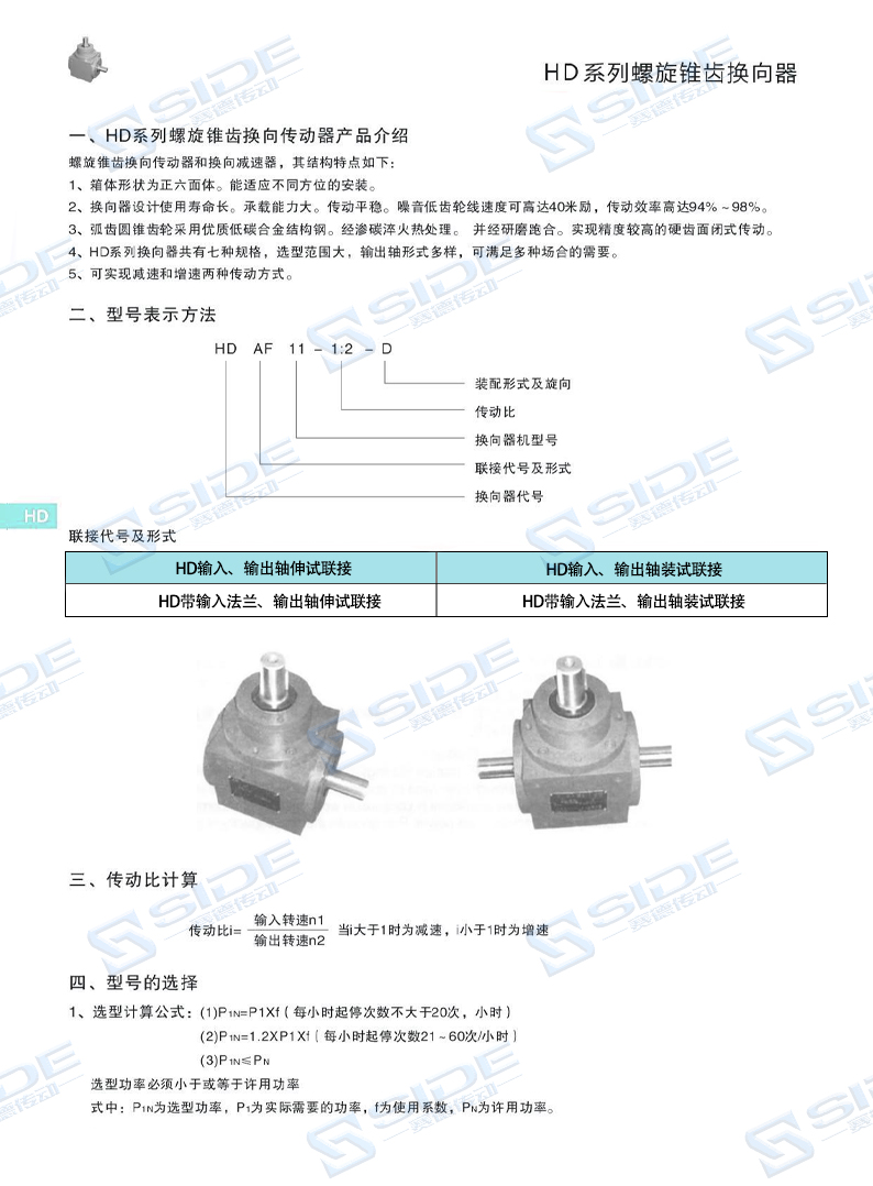 4、HD系列换向器共有七种规格,选型范围大,输出轴形式多样,可满足多种场合的需要。